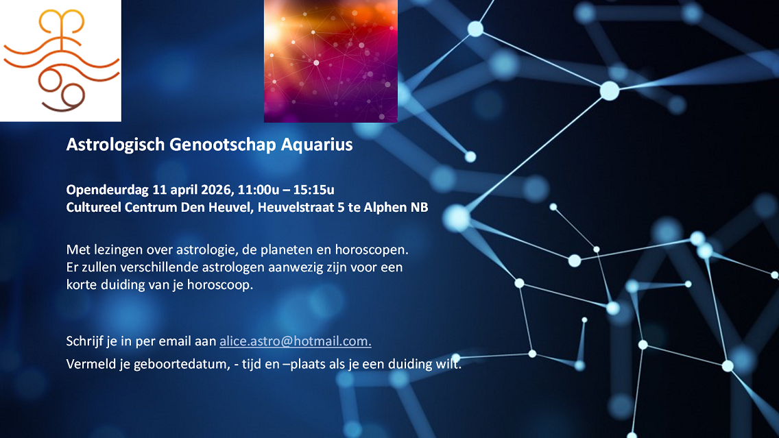 Je kunt je nog opgeven voor de open dag van Astrologisch Genootschap Aquarius op 11 april. Met gratis horoscoopduidingen door ervaren astrologen.